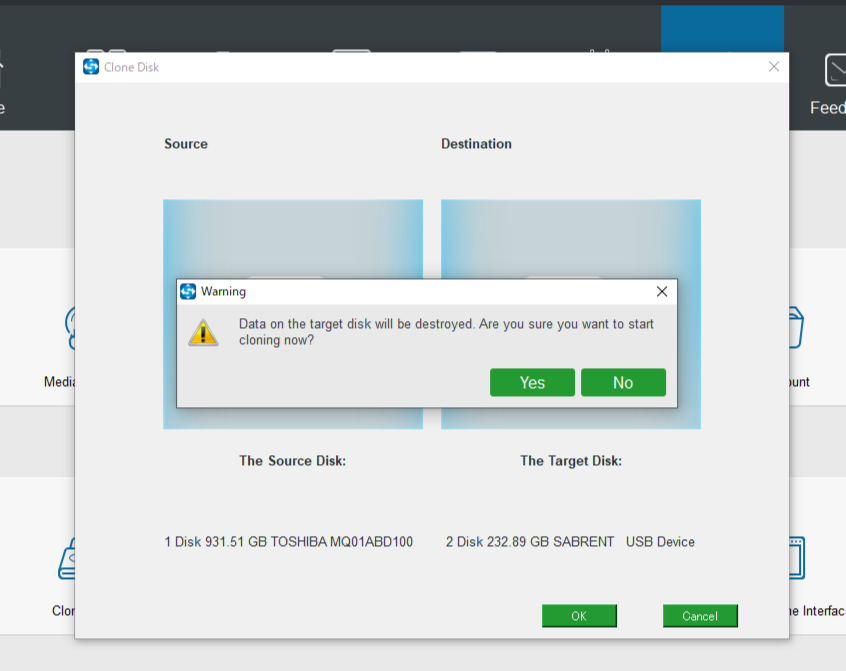 ターゲットディスク(クローン化するSSD)のデータがなくなるけど,クローン化していい?という感じ?もう一度,SourceとTargetを確認。「Yes」をクリーーーーーーック!