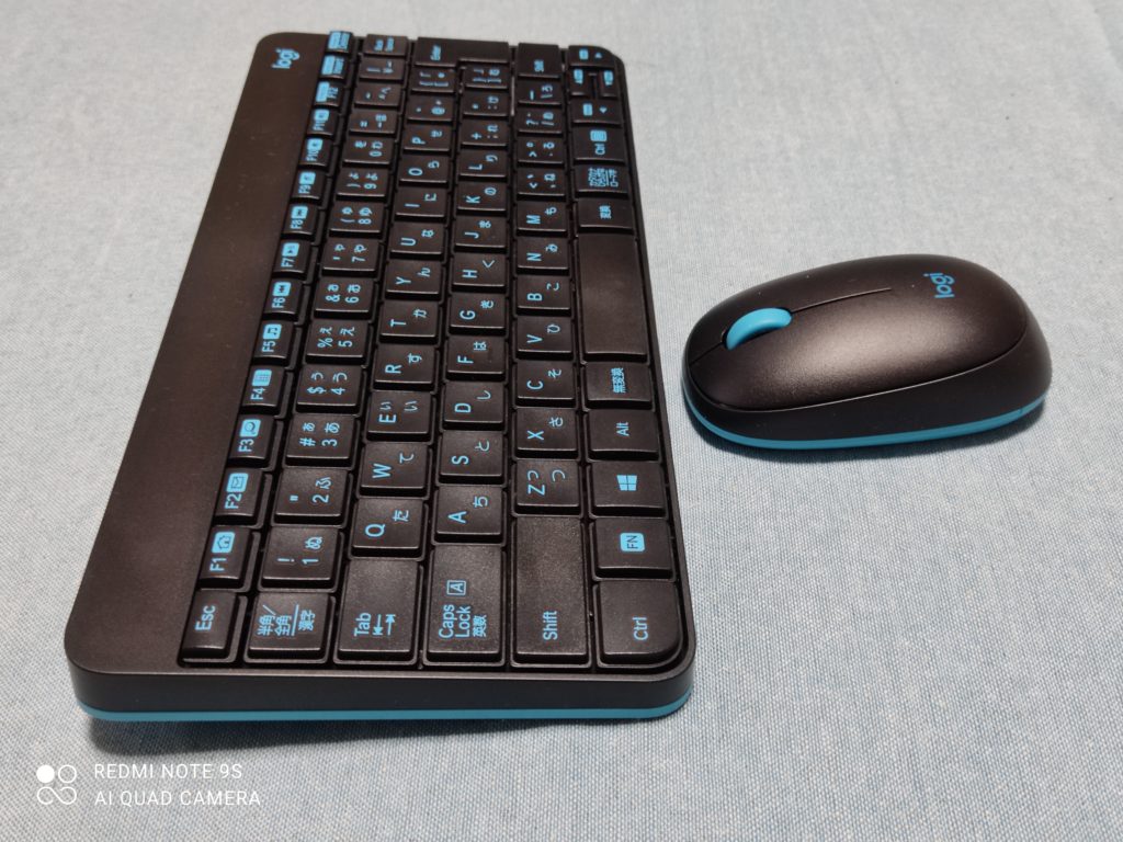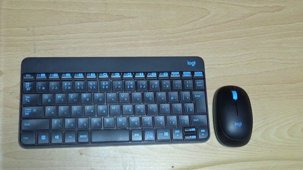 Logicoolのキーボード・マウスセット。単4電池で作動するタイプです。充電式より乾電池式のほうが電源切れを気にしなくてよいと思ったもんで。Wi-Fi接続タイプで,小さなUSBレシーバー(マウスに収納可能)がついています。