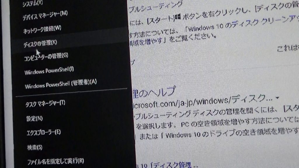 それでは,「スタートボタン右クリックメニュー」から「ディスクの管理」を選択しましょう。